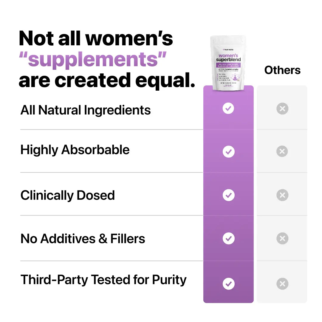 Unlike other supplements that only focus on one area like hair or skin, Women’s Superblend is clinically formulated to give women everything they truly need in one powerful blend, made with all-natural yet highly potent ingredients.